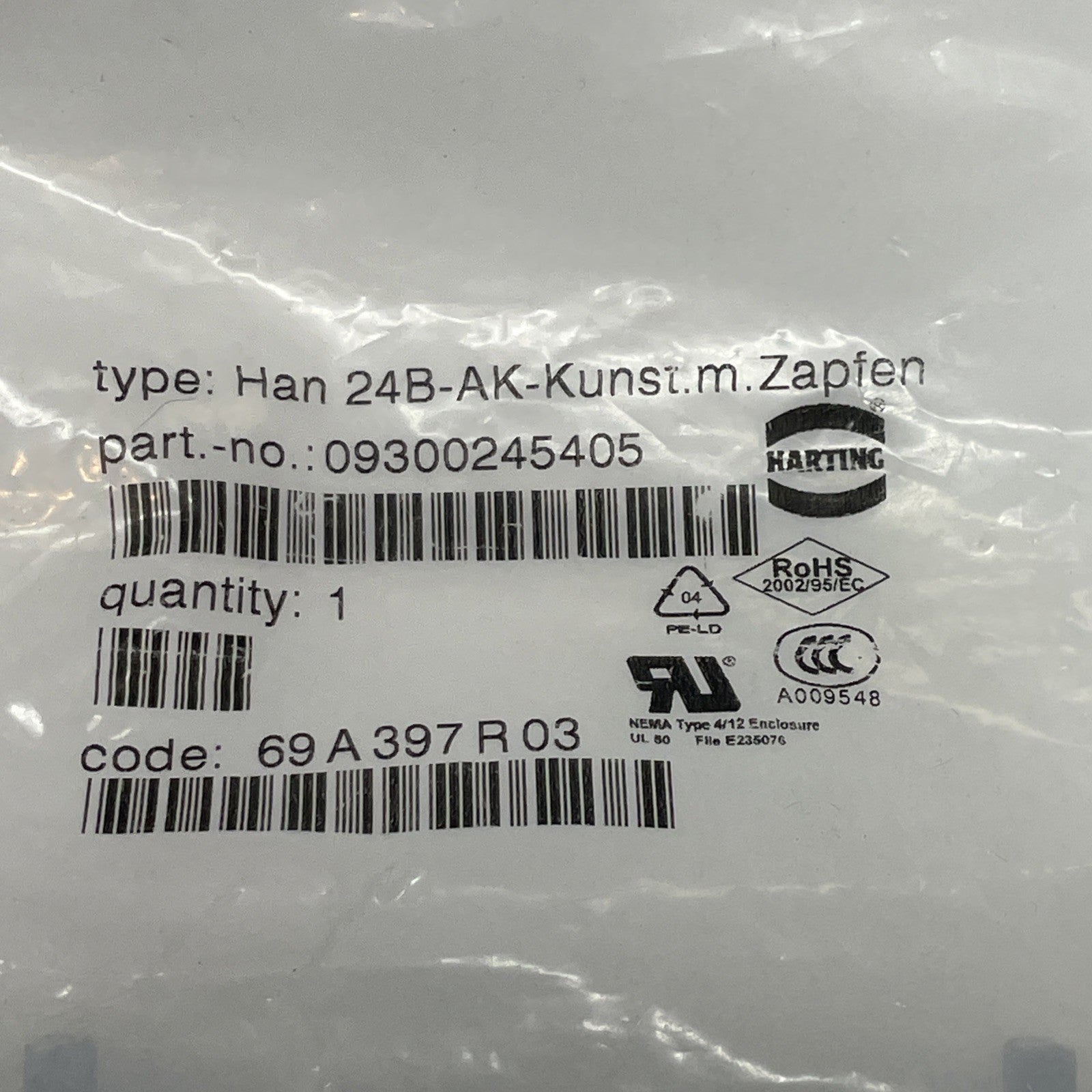 1PC Harting 09300245405, Protective Cap, Size 24B, (New)