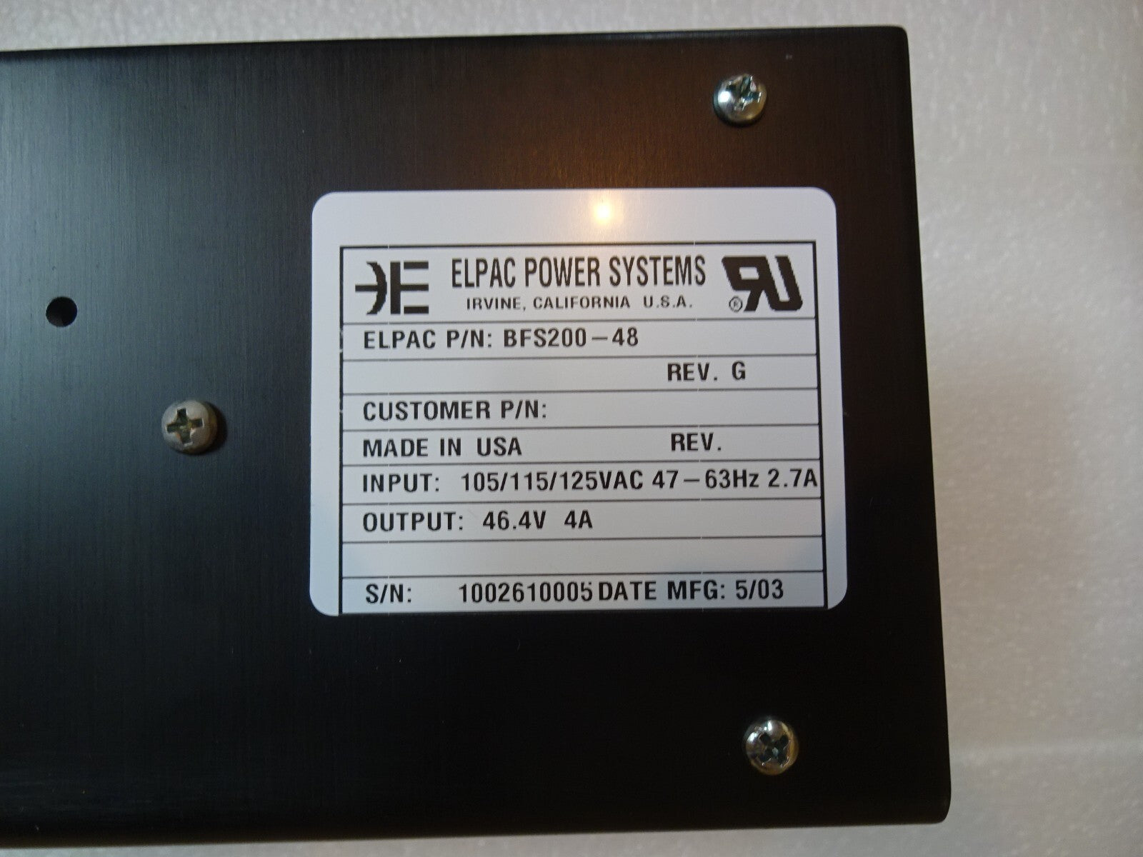 ELPAC BFS200-48 / POWER SUPPLY REV G 105/115/125VAC 47-63HZ 2.7A / NEW