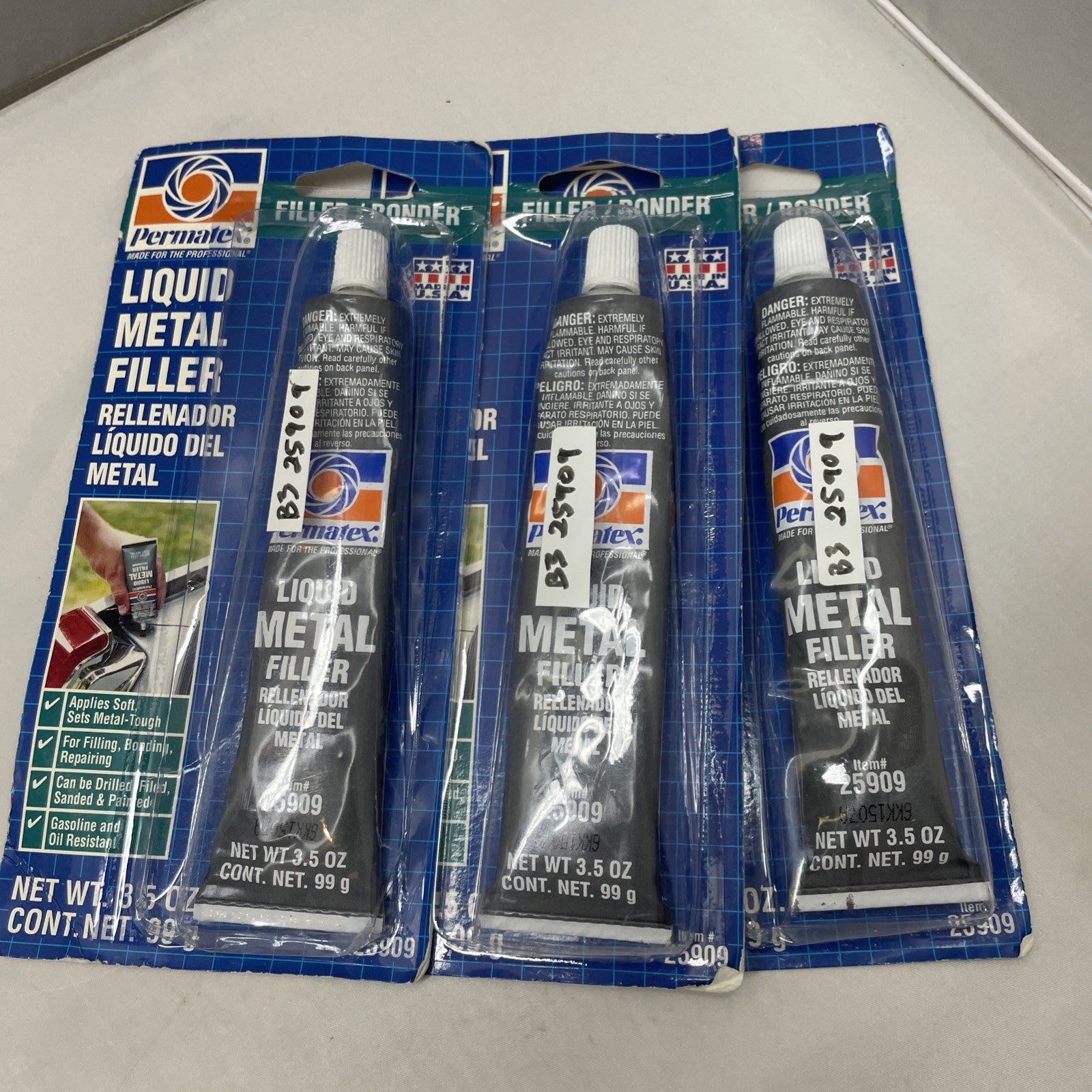 (LOT OF 3) Permatex 25909 - Liquid Metal Filler - 3.5oz Tube
