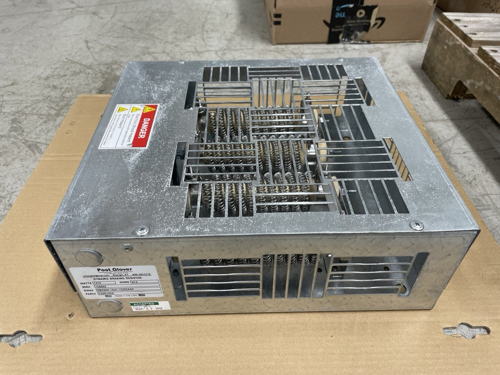 Post Glover T32R1K08 Dynamic Braking Resistor: 32Ω resistance, 1080W power rating. DB3C enclosure, 14"W x 10"D x 5"H. Compatible with Allen-Bradley PowerFlex drives (40, 70, 700, 750, 520 series). Rated for 240V, 480V, 600V applications. Please message with any questions.